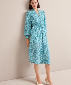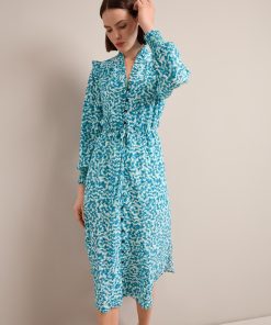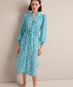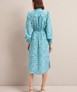 Stella Silk Midi Dress – Blue Green Feather Print